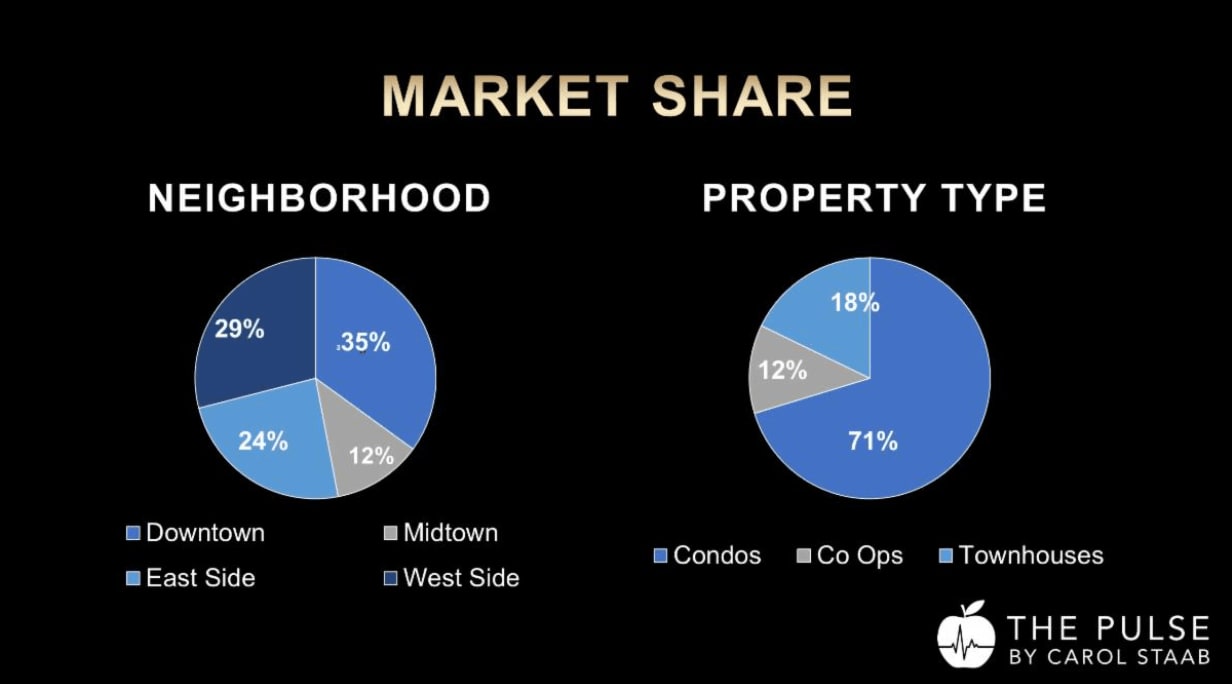 Property Types & Neighborhoods: Condominiums continue to dominate, claiming a 71% market share. Geographically, Downtown led with a 35% share, followed closely by the Upper West Side at 29%.