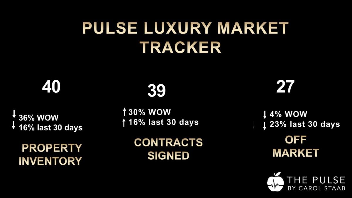 Market Pulse (Liquidity Pace) tracks the market’s contract momentum—how quickly luxury inventory is being absorbed. Higher = faster absorption and stronger seller leverage.